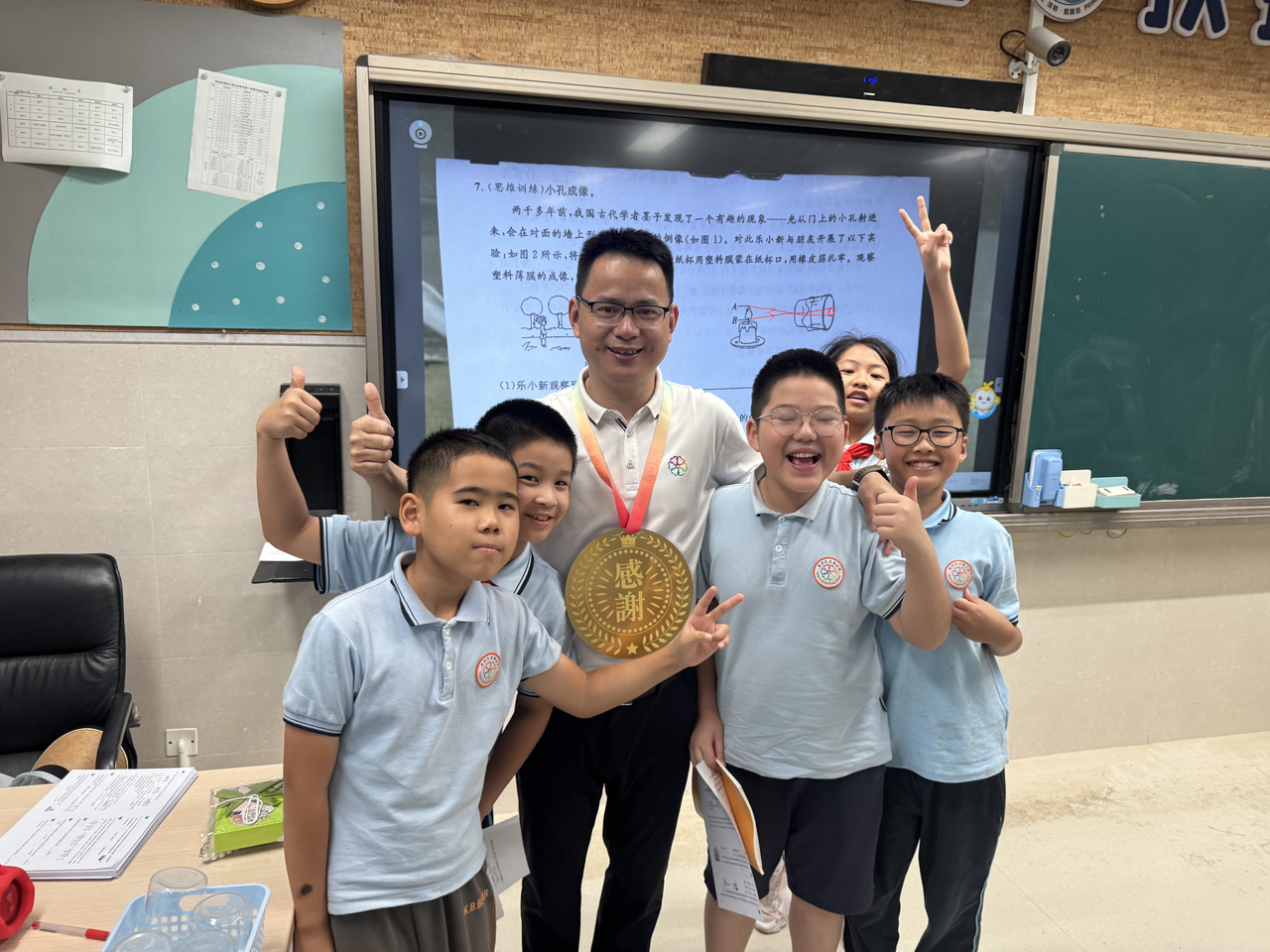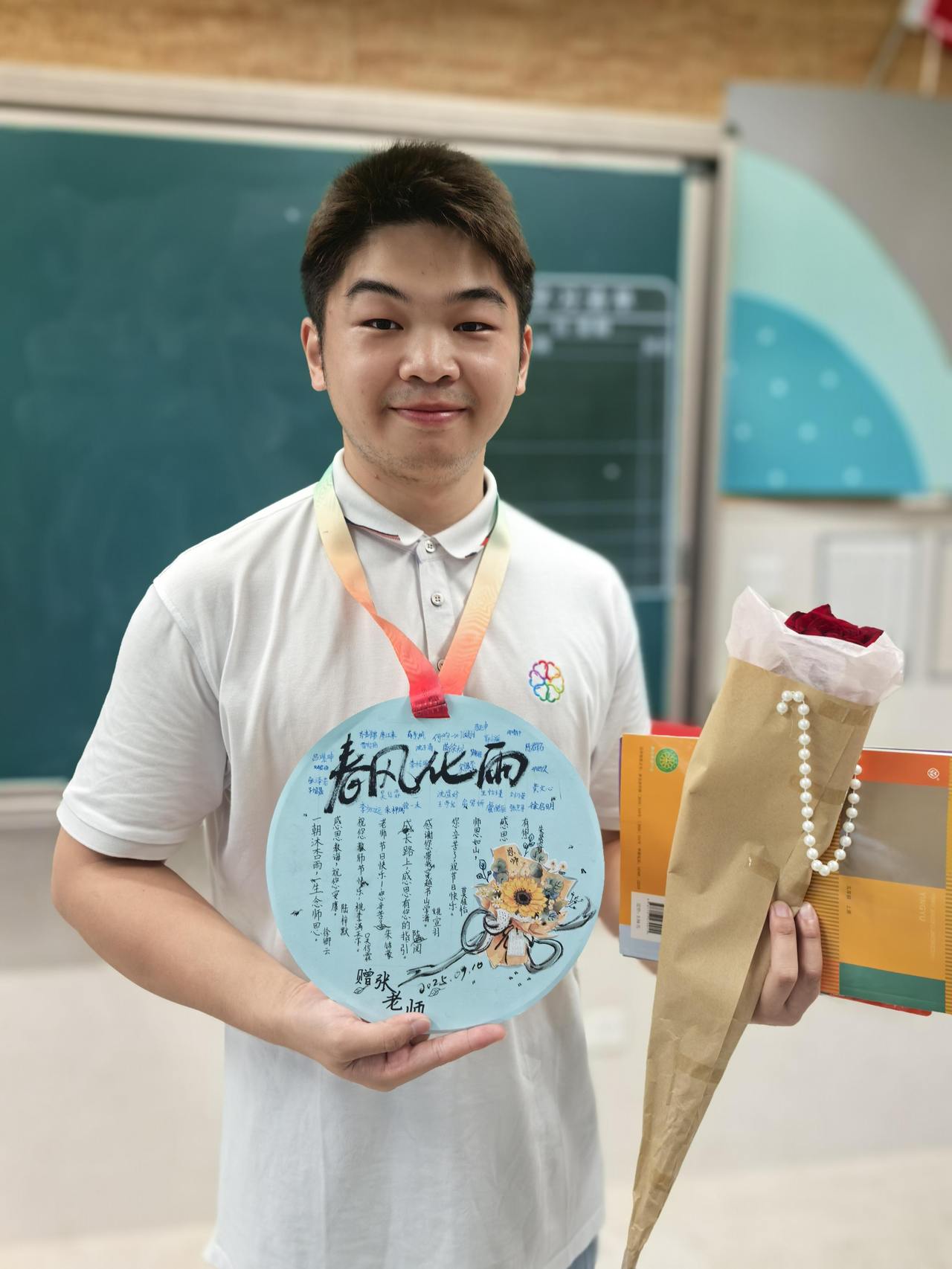 班主任骆老师拍下了最珍贵的画面:教师胸前的金牌与孩子们的笑脸交相辉映,黑板上的“教师节快乐”几个大字被阳光镀上了金边。